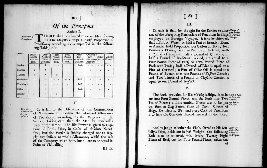 Amint az alábbi képen látható, az Ellátmányról című fejezet III. pontja említi az alkoholos italokat. Míg hazai vizeken naponta 1 gallon (3,785 liter) sör volt a fejadag, addig a Brit-szigetektől távol szolgálatot tevők ha a bor elérhető volt, abból 1 pintet (0,4732 liter), brandy, rum vagy arrak (délkelet-ázsiai párlat, mely kevésbé volt népszerű) esetén pedig fél pintet (0,2366 liter) kaptak. Ezt az adagot két részletben osztották ki (délelőtt és este), (nem)szabályozástól függően tisztán vagy vízzel különböző mértékben vegyítve.