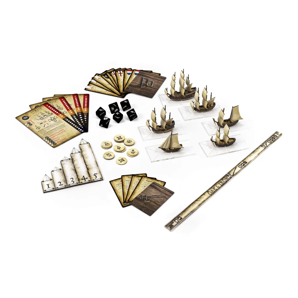 Mivel a téma (golden age of piracy, vagyis a kalózkodás aranykora) alapvetően a Karib-tengerhez kötődik, jár mellé egy kifejezetten szemrevaló korallzátonyos playmat. A dobókockákon kívül van a dobozban több pakli kártya (hajók, frakciók, kezdeményezés, események stb.), egy rakat keménykarton jelölő, szigetek, zátonyok is. A mozgás különböző méretű vonalzók mentén történik, ehhez nagyon hasonló a támadáskor használatos léc – mindkettő a tokenek alapanyagának megfelelő papírból.